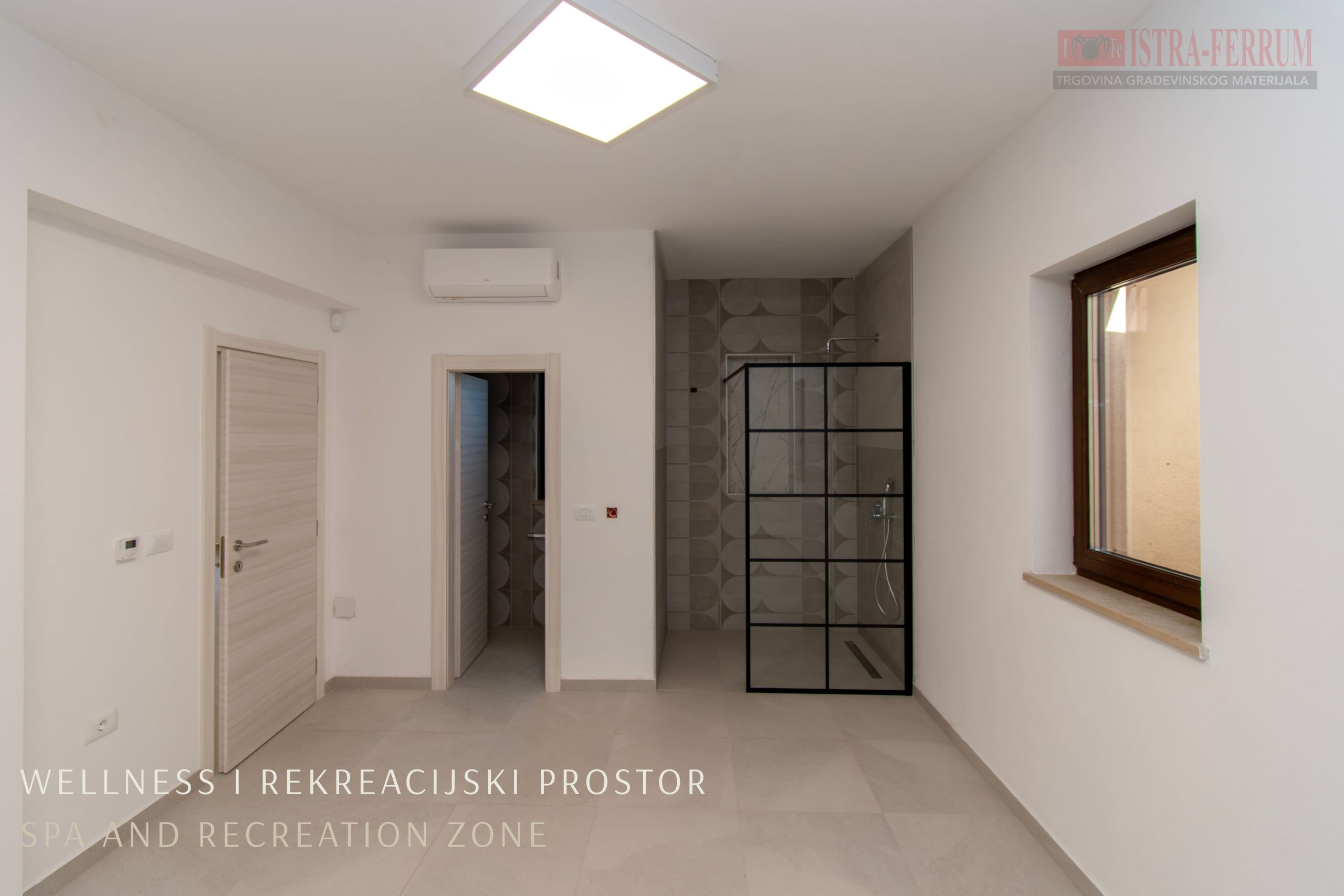 Prizemlje: prostor za druženje, spa zona s teretanom, saunom, jacuzzijem i tušem, konoba s kaminom i terasom, vinarija, vešeraj, tehnička soba, te dodatna prostorija za odmor s mogućnošću prenamjene.