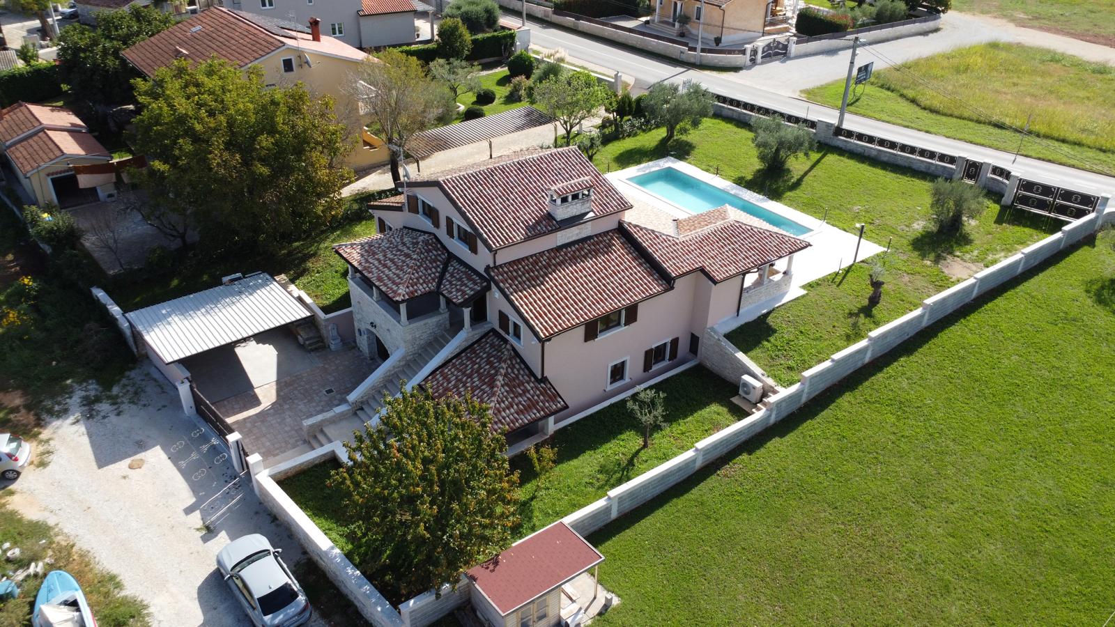 Nekretnina se nalazi na rubu parcele, što omogućuje dovoljno prostora za parkirna mjesta, bazen i dodatne sadržaje.