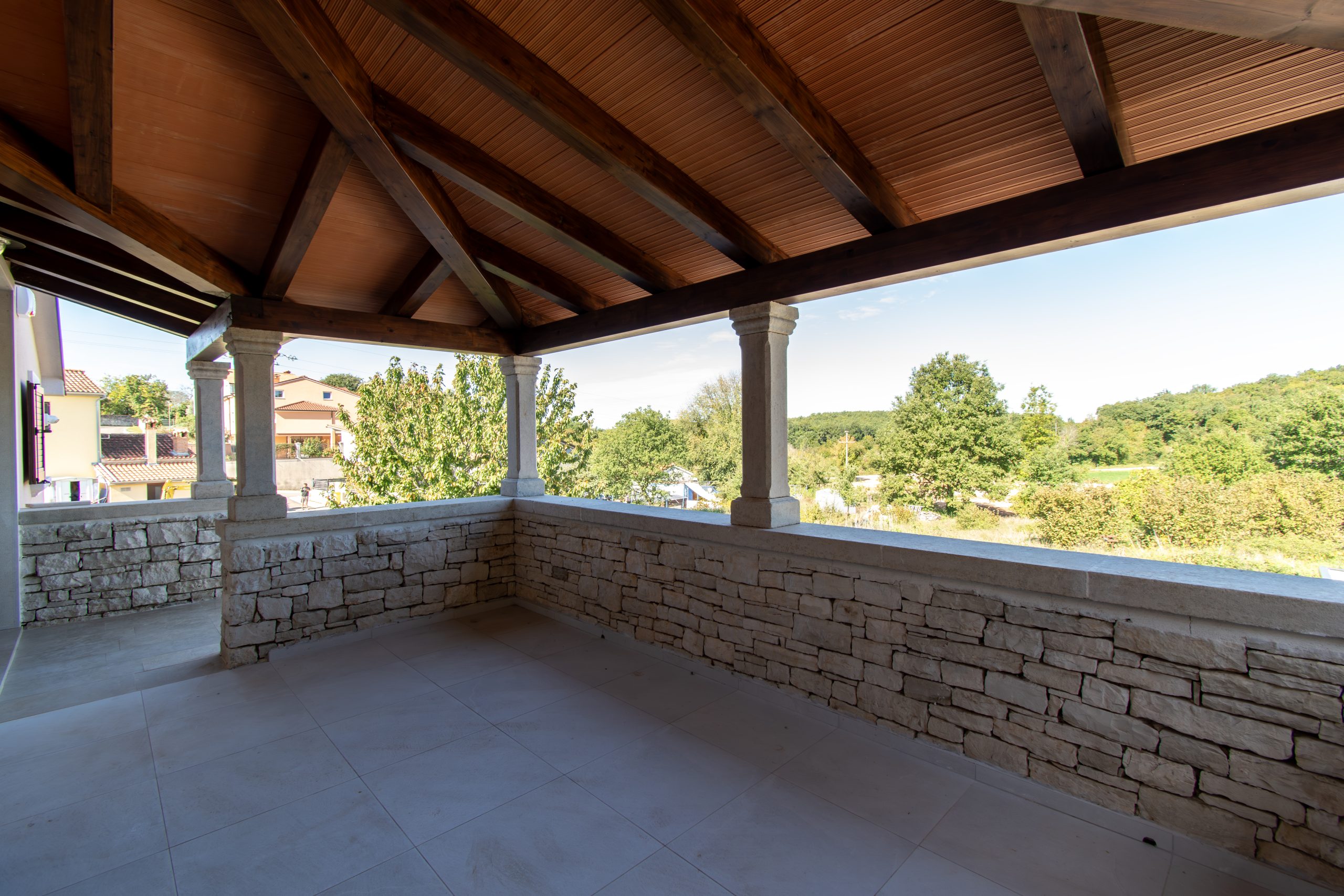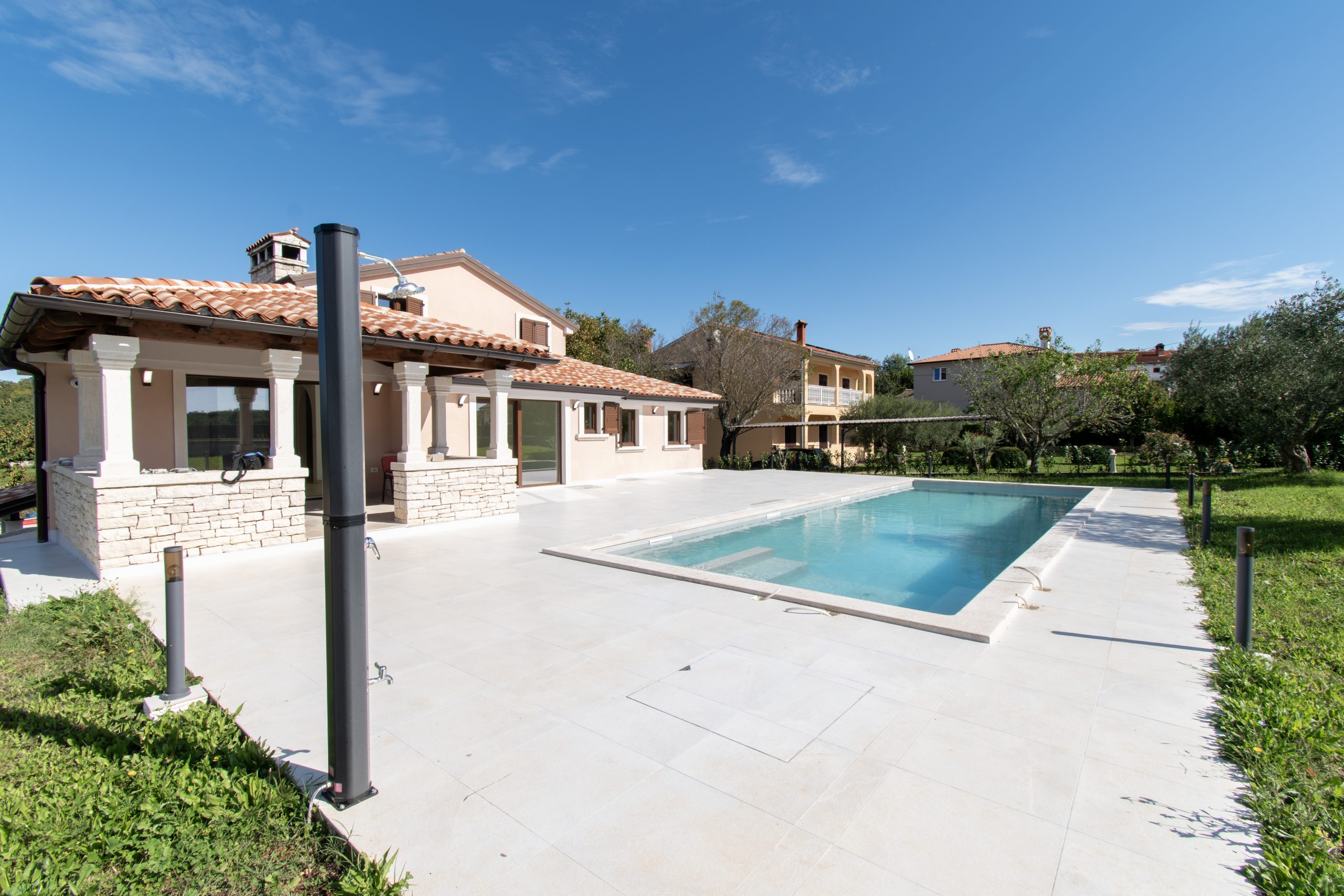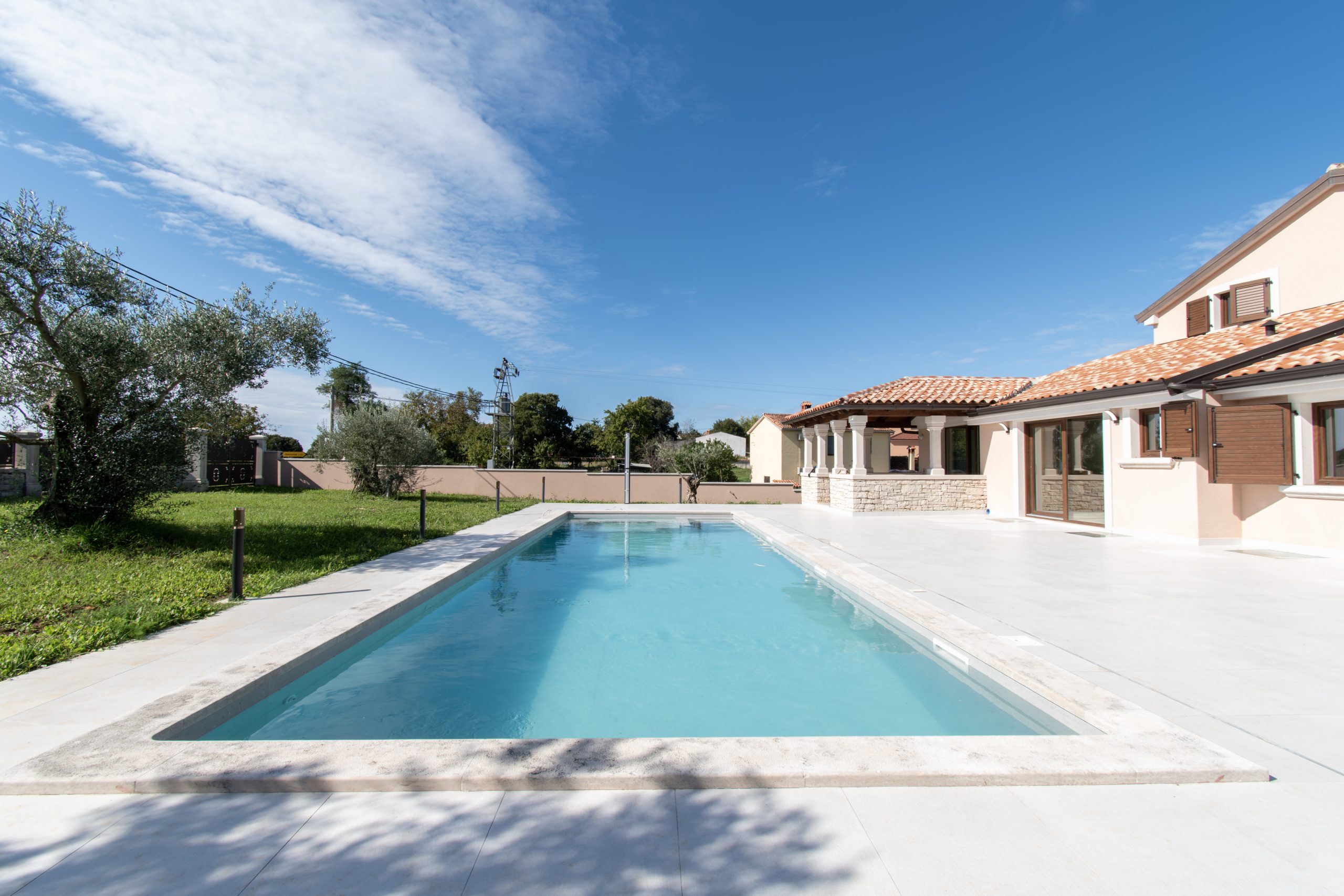 Na parceli od 1.280 m², okruženoj suhozidom i stoljetnim maslinama, pažljivo su spojeni istarski kamen, topli drveni elementi i vrhunski materijali u svakom detalju gradnje.