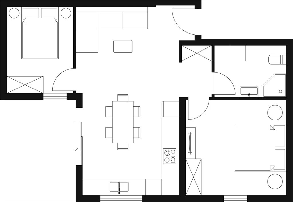 2 spavaće sobe (14,4 m² + 9 m²)